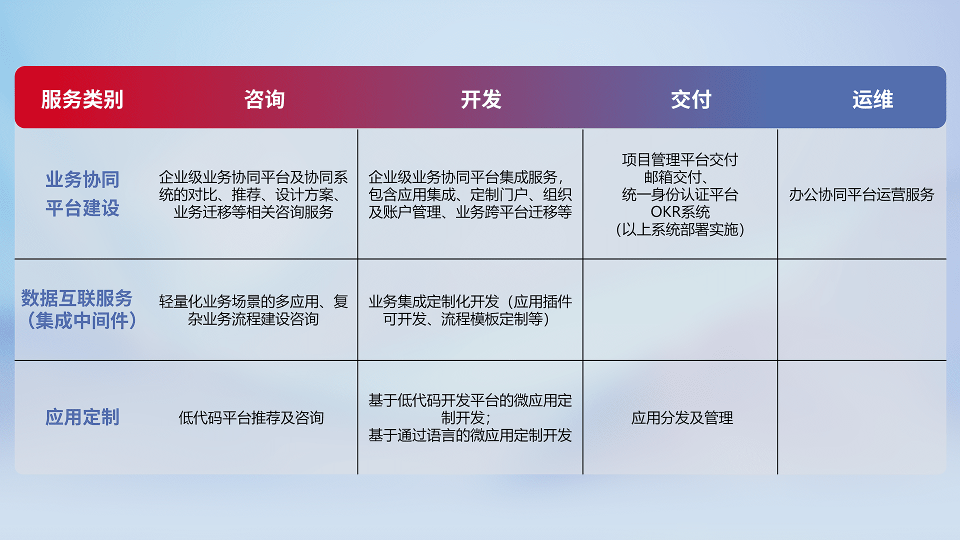 针对钉钉、、、企微、、IDaas等平台级产品提供产品的规划、、、方案、、、、交付、、定制化开发等服务,,,实现如统一协同办公、、、智能客户服务、、、、混合会议管理、、、、智能数据查询、、等业务场景,,,实现数字化转型。。。。