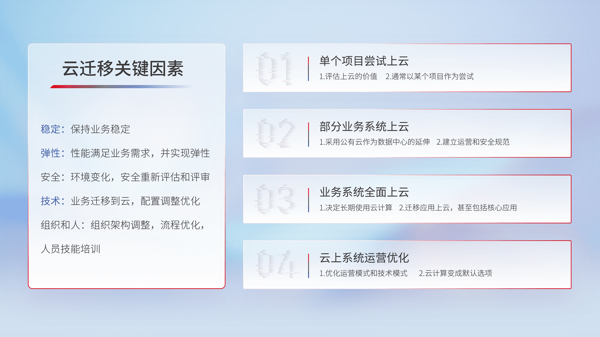 结合实际业务,,,,从规划设计、、、云平台选型、、、、云原生改造、、、数据迁移、、、集成交付,,,,迁移全过程为客户识别最佳上云路径,,,做好风险识别管理,,设计网络架构、、、身份权限、、、安全审计合规、、、、操作审计、、日志审计、、监控告警策略、、多站点容灾设计等,,,对云上基础设施进行整体规划,,,提升IT治理水平,,,,以满足弹性、、高可用、、、、高性能的需求。。