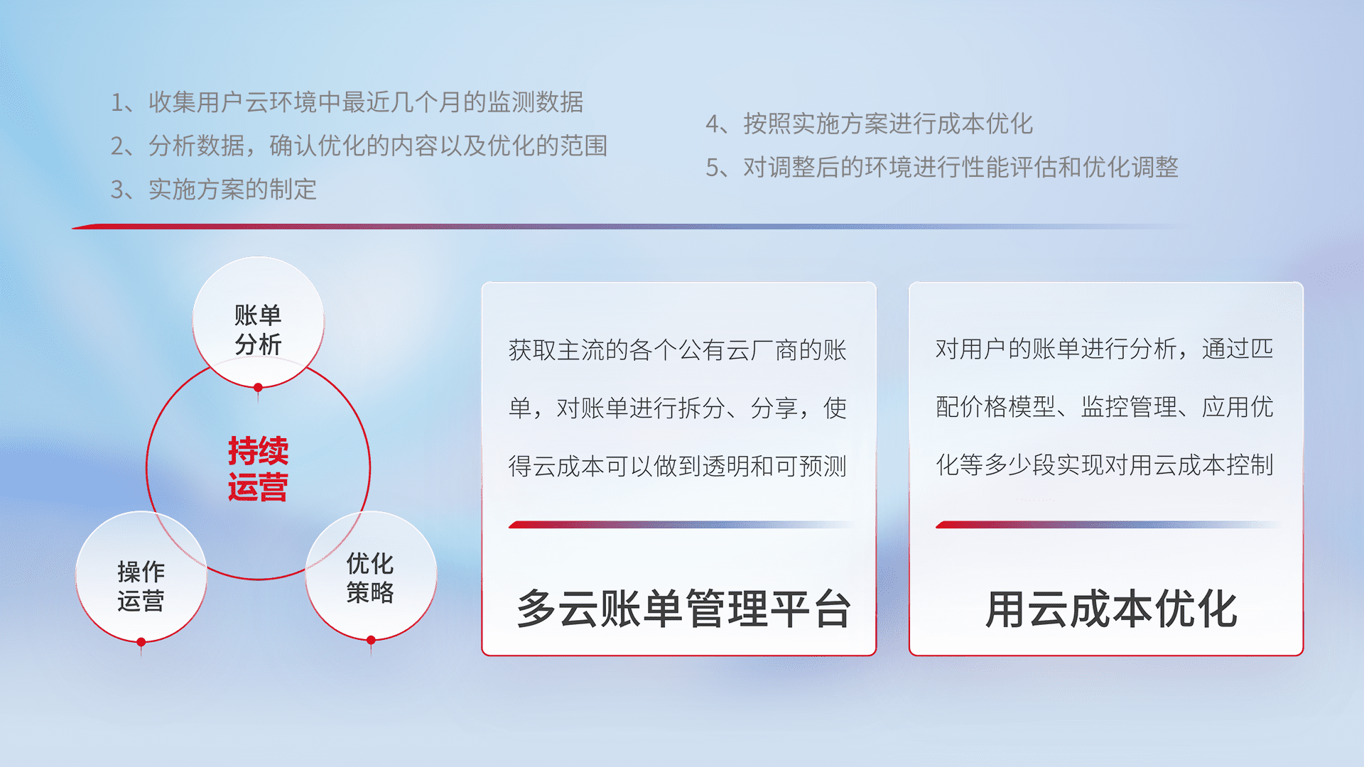 通过多云纳管,,,以统一的资源数据模型把客户的云资源进行抽象和封装,,,进而实现对多云资源的统一操作,,,,保障云资源管理的可靠性、、、稳定性与可用性。。。量身定制化运维内容,,,配置、、开发运维、、、、补丁管理、、备份、、监控、、、、认证和访问管理、、、、审计和日常巡检等,,保障在用云过程中的可靠度,,,稳定度以及高可用率。。。